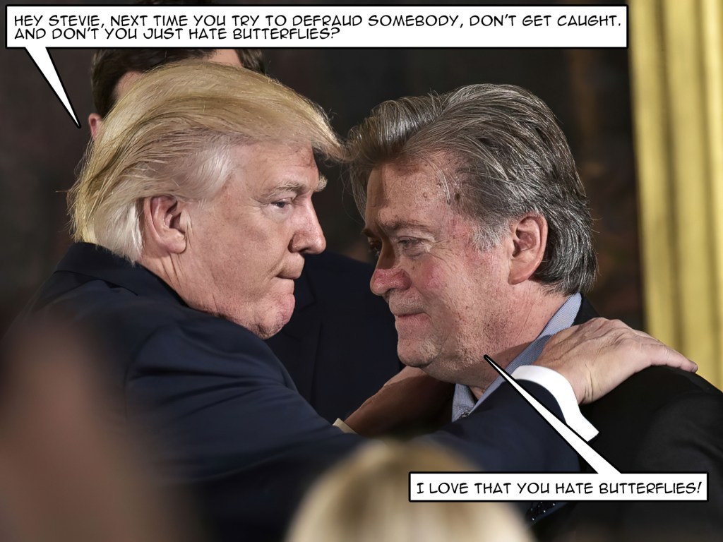 The 100-acre site along the Rio Grande is near the path of the promised wall that helped elect Trump, and its construction remains a magnet for his supporters. When the wall was discontinued, Steve, Who Should Be Banished, Bannon, and his cronies decided to take it into their own hands and raised money to build the wall in an area that ran through the sanctuary. Funny thing happened on the way to building this part of the wall. Bannon absconded with the funds and was charged with fraud. The Don then pardoned him.
