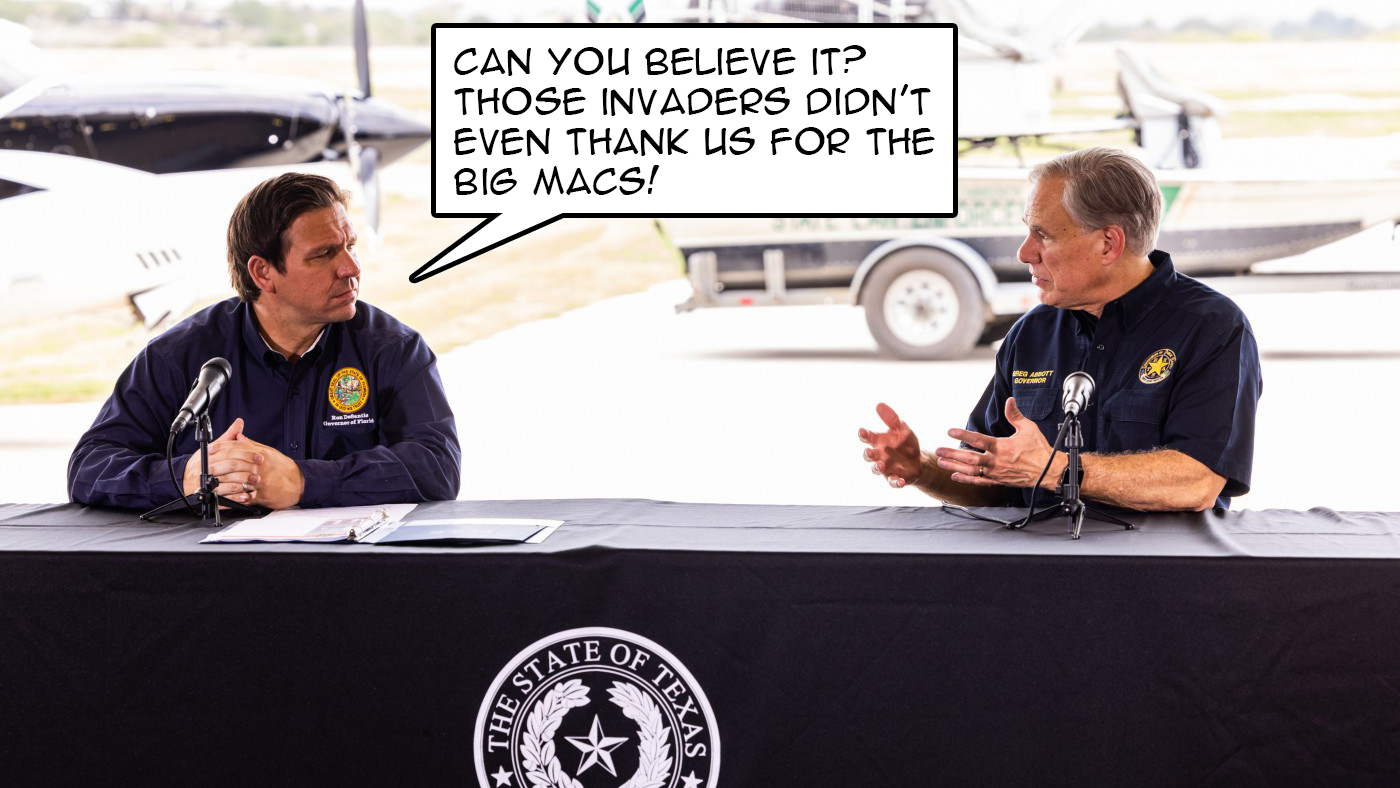 In the most recent iteration of “Cruelty is Us,” Ron DeSatanist and Greg Abbott decided to deceive Venezuelan immigrants seeking asylum by promising them to take them to a “sanctuary,” where there were people to help them get on their feet. The place was called Massachusetts.