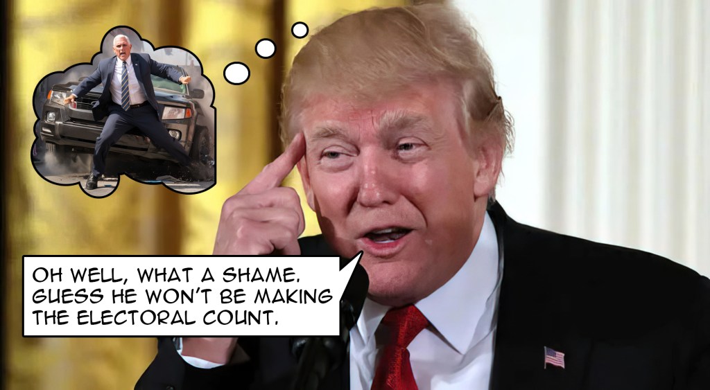 For instance take Mike Pence, our reluctant national hero. After all, he was the only thing standing between us and a constitutional crisis which threatened our democracy. What he did, by allowing the electoral votes to be counted, after the infamous insurrection, was, umm, do his job? But according to a note obtained by Jack Smith’s team, Pence was under so much pressure from The Don to refrain from his duties to count the electoral votes, he momentarily decided he would skip the proceedings altogether. To quote Pence, “too many questions” and it would be “too hurtful to my friend.” Speaking with Smith’s team, Pence insisted his loyalty to President Trump at the time never faltered — “My only higher loyalty was to God and the Constitution.” According to sources, The Don suggested to Pence that he not show; and let someone with some guts, like Chuck Grassley, who would be next in line to run the proceedings. Perhaps The Don suggested Pence call out with a stomach virus or say he was in a car accident? You know, streak yourself with red paint and go to the emergency room. If you aren’t comfortable with that approach, I can always arrange for someone to run you over.