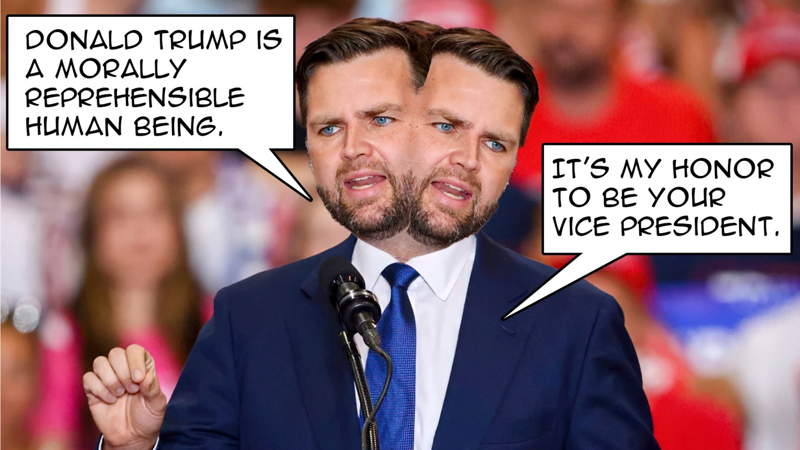From someone concerned about the treatment of black people in America to “disproportionately Black women” being sent to California for abortions? From someone whose close friend was transgender to someone who believes in the patriarchy, that women have more value when they have children? To concern about Muslims to an assault on immigrants. From Trump the “morally reprehensible human being” to his running mate? As you said J.D., it’s really creepy.”