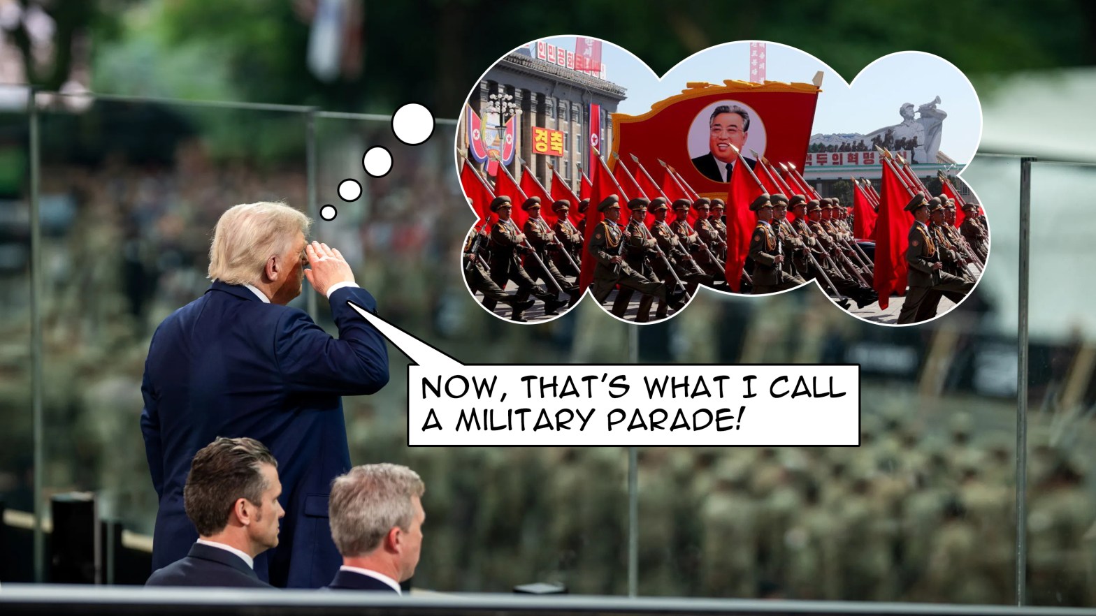 Dog: Too bad you didn’t have a military consultant from North Korea advise Predator Hegseth…Oops, disregard that comment, that was inappropriate, sir. I meant Peter. But you would have been very pleased if they marched like the North Korean military when honoring your friend Kim Jung-un. I do very much like their goose stepping. It’s cool. It’s like the Rockettes with weapons.