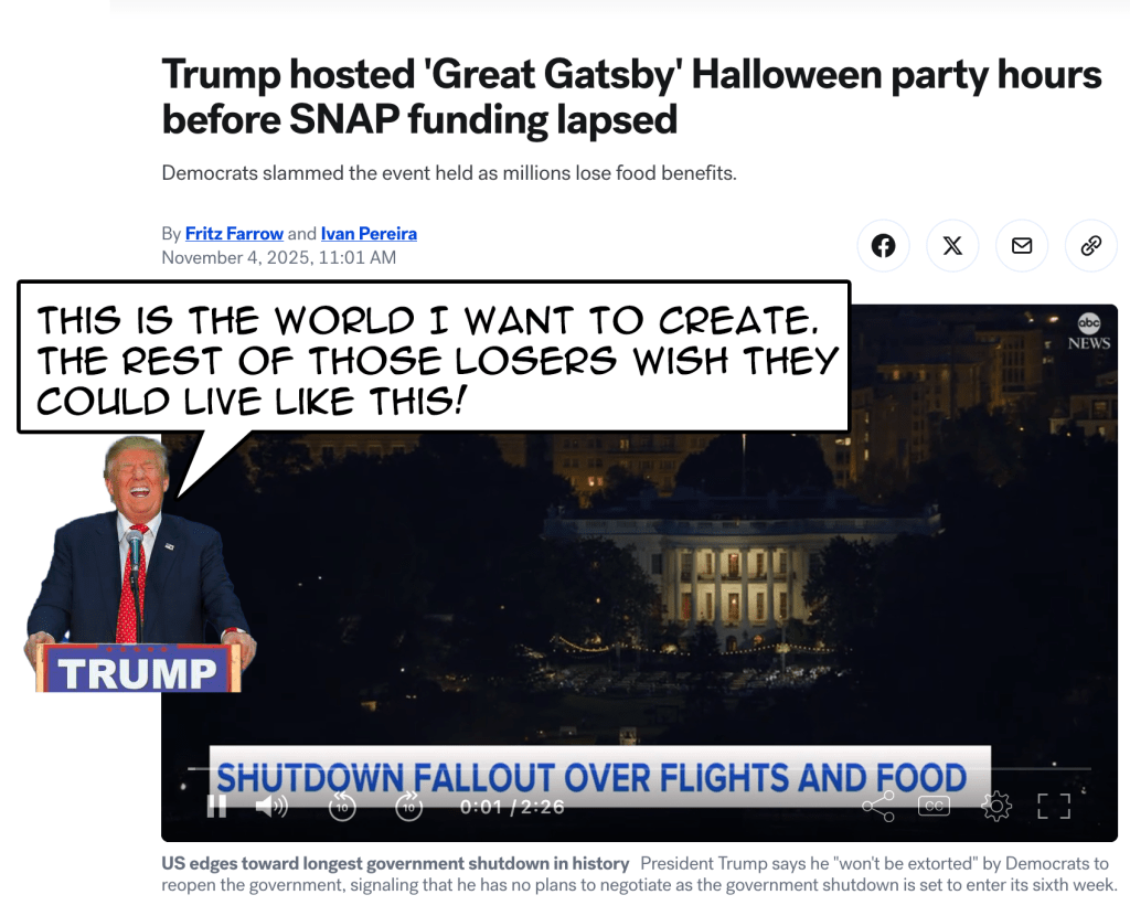 The cruelty of The Don and his cronies is on full display in its despicable and frankly, immoral response to funding SNAP. It is a lifeline for over 40 million Americans who will have food taken off their tables. Forget the morality of maintaining the funds, but from a political perspective, wouldn’t it make sense to make sure children aren’t hungry? Imagine the anger, stress, and fear denying people food assistance creates. You would think that it would be one of those no-brainers to fund, right? It’s political suicide, right?