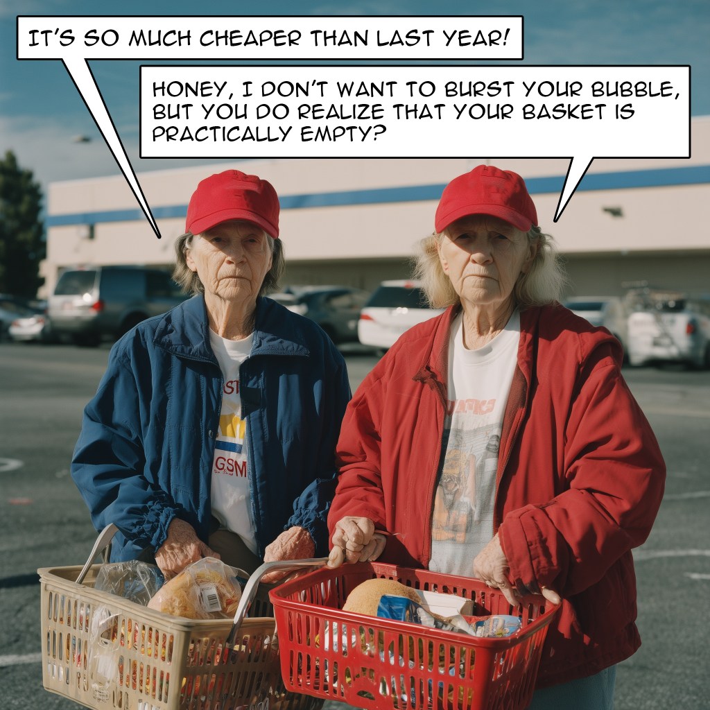 Before he decided to reverse some of the tariffs and was still in a state of denial, he crowed about how wonderful the economy was because of the reduced Thanksgiving dinner at Walmart. He said that there was “no inflation, that gas prices were almost at $2, and grocery prices were way down.” To illustrate the point, he repeatedly pointed to a report from Walmart showing that the cost of a Thanksgiving meal would be 25% less than under President Joseph R. Biden Jr.