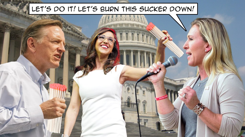The Don is in a panic and even hauled Lauren Boebert into the White House. He met with her in the Situation Room of all places. Must have been some serious shit being discussed. That’s the place the generals and other cabinet members huddled together to create the plan to take out Osama Bin Laden. Seems like The Don chose this scenario to impress upon Boebert the seriousness of the task at hand, as if she were a threat to national security. Boebert declined to cooperate. Bam. Right between the eyes. I can only imagine the expletives flying out of The Don’s mouth. By the time he got to Truth Social all he had to say was that any Republicans voting for this were “stupid.” Sorry Don, sticks and stones will break their bones but calling them stupid, that’s so pathetic.